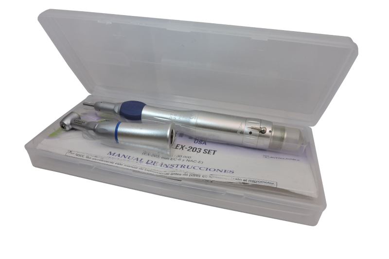 Optimiza tus procedimientos en odontología veterinaria con el micromotor con contra ángulo DTM USA, diseñado para ofrecer precisión, confort y rendimiento confiable en cada intervención. Este equipo cuenta con acople tipo Borden y spray interno. Su rotación es ajustable entre 5.000 y 20.000 rpm, con sentido de giro reversible, lo que brinda mayor control en tratamientos dentales de animales de distintas especies. Su encaje universal permite compatibilidad con la mayoría de los sistemas existentes. Incluye: – Punta recta con spray externo y sistema de cambio de fresa mediante anillo, facilitando la manipulación rápida y segura – Contra ángulo tipo push button con spray único, bajo nivel de ruido y vibración, además de un diseño con giro libre de 360º, lo que mejora la ergonomía y el acceso en cavidades bucales pequeñas. Recomendado para clínicas veterinarias que buscan equipos duraderos y funcionales para su unidad de profilaxis o cirugía oral. Cuenta con garantía limitada de 3 meses.